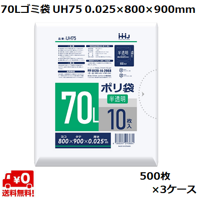 70L ゴミ袋 半透明 UH75 (500枚×3ケース) HDPE 0.025×800×900mm 業務用 ポリ袋 ごみ袋 大容量 まとめ買い