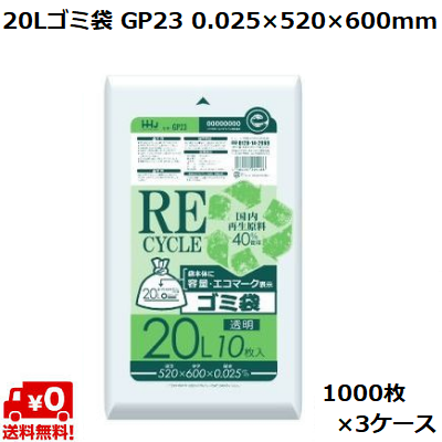 20L ゴミ袋 透明 GP23 (1000枚×3ケース) LLDPE 容量表示入 エコマーク入 0.025×520×600mm 業務用 ポリ袋 ごみ袋 大容量 まとめ買い